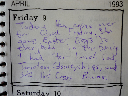 Who scheduled the long weekend during Blog Every Day April? Blerg. Anyway, today I’m offering up a piece of my personal diary from Good Friday 16 years ago. I was ten years old. Colsore!